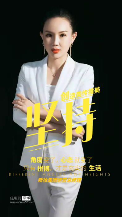 美业是创造美的行业,我们不仅要创造美还要引领美、传播美,去搭建一个给更多女性低成本创业的平台,让更多女性有机会展现自我,改变生活,活出精彩就像新妆集团的经营理念一样“让每一位女性拥有健康美丽、自信的人生!”。任玥羽引领更多女性走进了新妆集团,带领上千人的营销团队,助力更多女性实现人生的华丽蜕变。